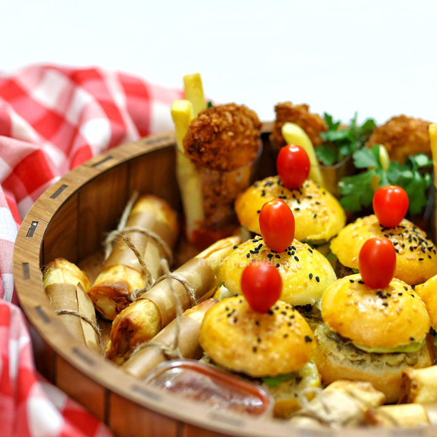 میزان تنوع: شامل 3 مدل فینگرفود (مینی برگر 6تا، شات فیله مرغ سوخاری 8تا، اسپرینگ رول مرغ 6تا) همراه با سس مخصوص.