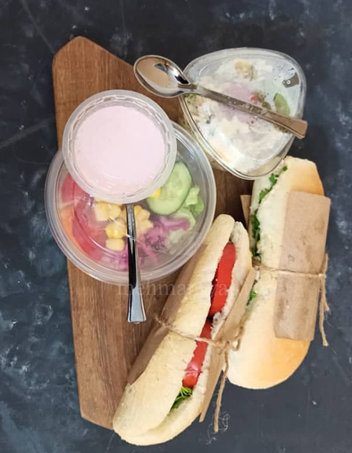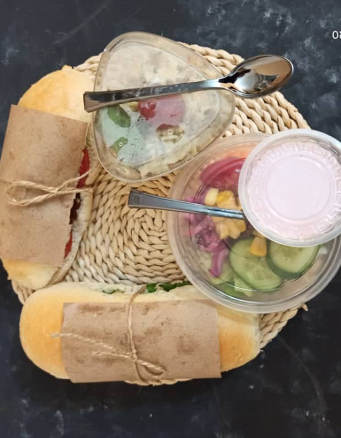 میزان تنوع: شامل 5 آیتم:جعبه سفید دسته دار، شات سالاد ماکارونی و سالاد فصل، مینی ساندویچ الویه و کتلت.